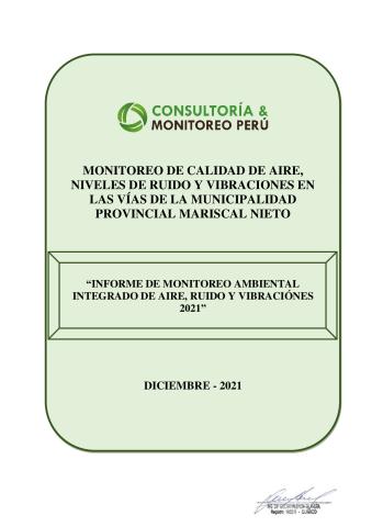 La Municipalidad Provincial Mariscal Nieto en el año 2021 solicitó el apoyo técnico a la empresa Anglo American Quellaveco, con el objetivo de monitorear la calidad de aire, ruido y vibraciones en las vías de alto tránsito vehicular en la ciudad de Moquegua, lo cual, permitira conocer los valores reales de la calidad y ser comparados con los estandares de calidad ambiental establecidos. El presente informe constituye el primer monitoreo de calidad ambiental realizado en el 2021 y detallado los resultados obtenidos en campo y laboratorio realizados por la empresa Consultoria y Monitoreo del Perú (CYM), los cuales, incluyen la explicacion técnica. Los trabajos fueron realizados entre el 07 de diciembre al 28 de diciembre del 2021. Realizandose la medición de variables de calidad de aire en 08 puntos de monitoreo (05 ciclos de 24 horas), la medición de ruido 08 puntos de monitoreo (02 ciclos de 24 horas) y niveles de vibracion 08 puntos de monitoreo (02 ciclos de 24 horas).
