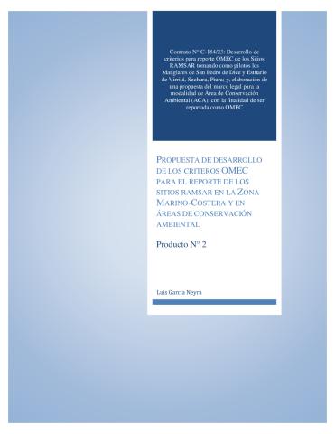 El documento presenta una propuesta para el desarrollo de criterios para el reporte de Otras Medidas Efectivas de Conservación basadas en Áreas (OMEC) de los Sitios Ramsar y Áreas de Conservación Ambiental (ACA) en la zona marino-costera del Perú. Se enfoca en los Manglares de San Pedro de Vice y el Estuario de Virrilá, ubicados en Sechura, Piura, como casos de estudio.