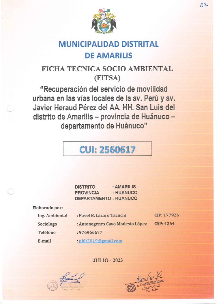 "Recuperación del servicio de movilidad urbana en las vías locales de la av. Perú y av. Javier Heraud Pérez del AA. HH. San Luis del distrito de Amarilis - provincia de Huánuco - departamento de Huánuco".