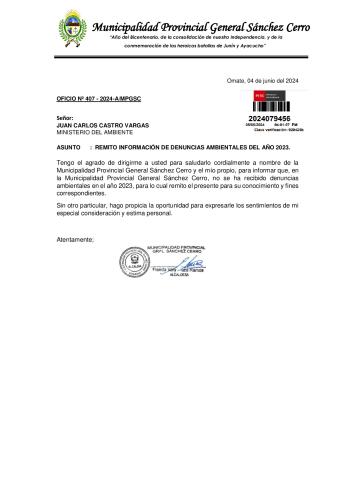 Remito información de denuncias ambientales del año 2023 presentadas ante la Municipalidad Provincial General Sánchez Cerro