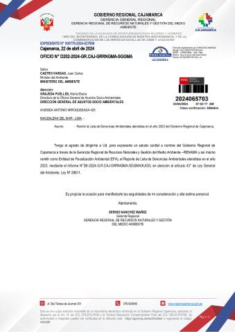 Remito la Lista de Denuncias Ambientales atendidas en el año 2023 del Gobierno Regional de Cajamarca.