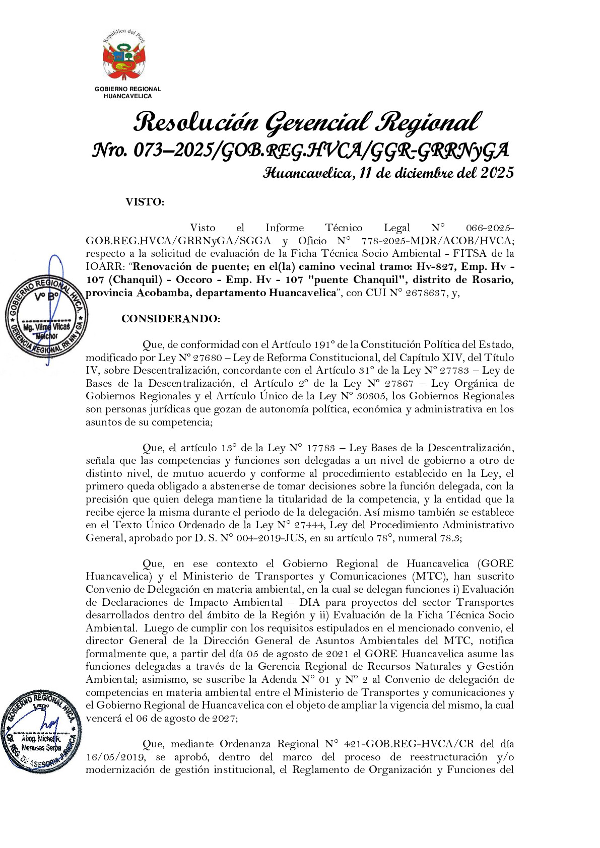 El proyecto de renovación del puente en el camino vecinal, tramo HV-827: EMP. HV-107 (Chanquil) – Occoro – EMP. HV-107 (puente Chanquil), ubicado en el distrito de Rosario, provincia de Acobamba, departamento de Huancavelica, tiene como objetivo mejorar las condiciones estructurales y de seguridad de la infraestructura vial. La intervención permitirá garantizar un tránsito vehicular y peatonal seguro, asegurar la continuidad del transporte y fortalecer la conectividad entre los centros poblados del área de influencia, contribuyendo al desarrollo social y económico de la población beneficiaria.