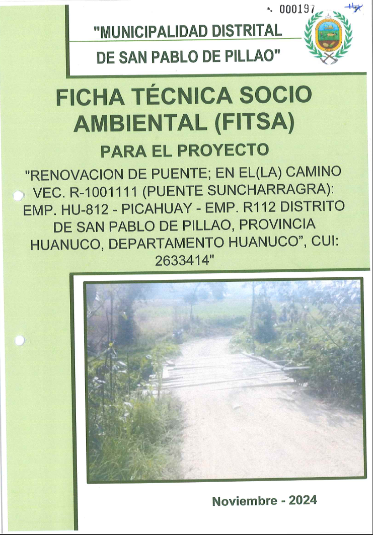 Elaborar una Ficha Técnica Socio Ambiental (FITSA) mediante la cual se realice la identificación de los impactos ambientales que puedan ocurrir durante el desarrollo de las actividades del proyecto "Renovación de Puente; En El(La) Camino Vec. R-1001111 (Puente Suncharragra): Emp. Hu-812 - Picahuay - Emp. R112 Distrito De San Pablo De Pillao, Provincia Huánuco, Departamento Huánuco", y plantear las medidas de mitigación, logrando de esta manera que todas las etapas de esta obra se realicen en armonía con la conservación de medio ambiente, las mismas que deben ser conocidas por el contratista para ser aplicadas durante la ejecución de la obra.