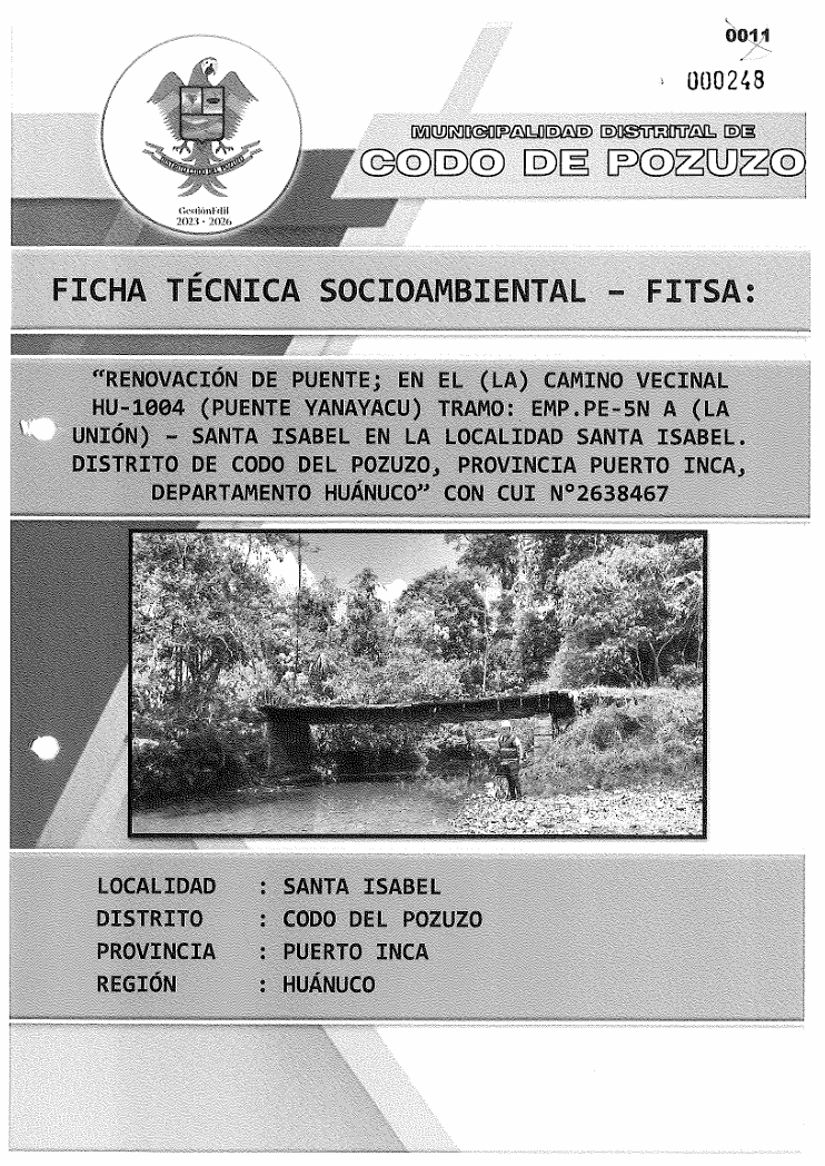 Elaborar la Ficha Técnica Socio Ambiental (FITSA) que permita Identificar y caracterizar los impactos ambientales y socio económicos que pudieran derivarse de la implementación del IOARR: "RENOVACION DE PUENTE; EN EL(LA) CAMINO VECINAL HU-1004 (PUENTE YANAYACU) TRAMO: EMP. PE-5N A (LA UNION) SANTA ISABEL EN EL CENTRO POBLADO SANTA ISABEL, DISTRITO DE CODO DEL POZUZO, PROVINCIA PUERTO INCA, DEPARTAMENTO HUANUCO", con Código Único de Inversiones No 2638467, considerando las medidas para prevenir, mitigar, corregir o compensar los impactos negativos.