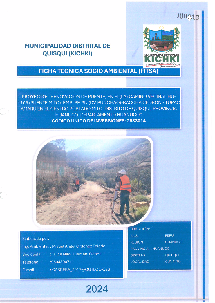 Elaborar una Ficha Técnica Socio Ambiental (FITSA) mediante la cual se realice la identificación de los impactos ambientales que puedan ocurrir durante el desarrollo de las actividades del proyecto: "RENOVACIÓN DE PUENTE; EN EL(LA) CAMINO VECINAL HU-1105(PUENTE MITO): EMP. PE-3N (DV. PUNCHAO)-RACCHA CEDRÓN - TUPAC AMARU EN EL CENTRO POBLADO MITO, DISTRITO DE QUISQUI, PROVINCIA HUÁNUCO, DEPARTAMENTO HUÁNUCO" - CUI: 2633014