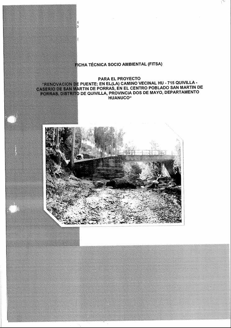 Elaborar una Ficha Técnica Socio Ambiental (FITSA) mediante la cual se realice la identificación de los impactos ambientales que puedan ocurrir durante el desarrollo de las actividades del proyecto "RENOVACION DE PUENTE; EN EL(LA) CAMINO VECINAL HU 715 QUIVILLA CASERIO DE SAN MARTIN DE PORRAS, EN EL CENTRO POBLADO SAN MARTIN DE PORRAS, DISTRITO DE QUIVILLA, PROVINCIA DOS DE MAYO, DEPARTAMENTO HUANUCO" y plantear las medidas de mitigación, logrando de esta manera que todas las etapas de esta obra se realicen en armonía con la conservación del medio ambiente, las mismas que deben ser conocidas por el contratista para ser aplicadas durante la ejecución de la obra.