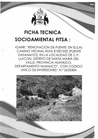 Elaborar la Ficha Técnica Socio Ambiental (FITSA) que permita Identificar y caracterizar los impactos ambientales y socio económicos que pudieran derivarse de la implementación del IOARR: "RENOVACION DE PUENTE; EN EL(LA) CAMINO VECINAL RUTA R1001032 (PUENTE DASAMAYO): EN LA LOCALIDAD DE C.P. LLACON, DISTRITO DE SANTA MARIA DEL VALLE, PROVINCIA HUANUCO, DEPARTAMENTO HUANUCO", con Código Único de Inversiones N° 2633304, considerando las medidas para prevenir, mitigar, corregir o compensar los impactos negativos.