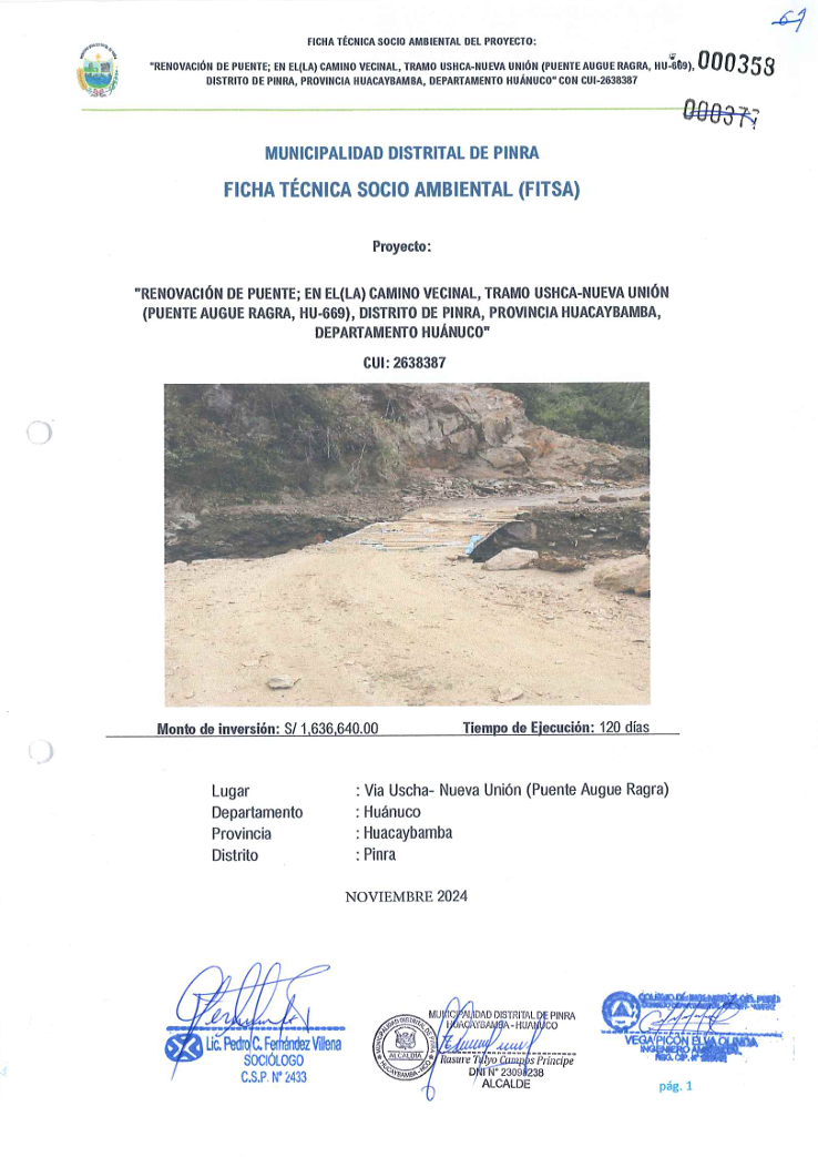 Renovación de puente; en el(la) camino vecinal, tramo Ushca-Nueva Unión (puente Augue Ragra, hu-669), distrito de Pinra, provincia Huacaybamba, departamento Huánuco.
