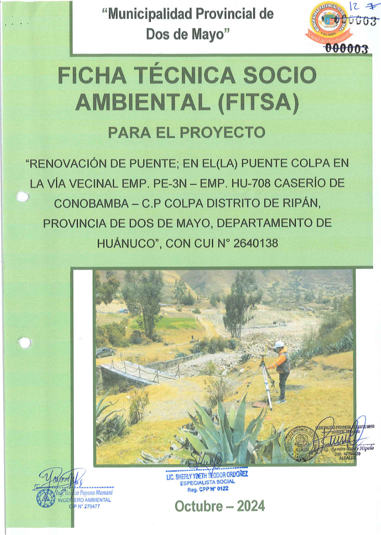 Elaborar una Ficha Técnica Socio Ambiental (FITSA) mediante la cual se realice la identificación de los impactos ambientales que puedan ocurrir durante el desarrollo de las actividades del proyecto: "RENOVACIÓN DE PUENTE; EN EL(LA) PUENTE COLPA EN LA VÍA VECINAL EMP. PE-3N EMP. HU-708 CASERÍO DE CONOBAMBA-C.P COLPA DISTRITO DE RIPÁN, PROVINCIA DE DOS DE MAYO, DEPARTAMENTO DE HUÁNUCO", CON CUI N° 2640138 y plantear las medidas de mitigación, logrando de esta manera que todas las etapas de esta obra se realicen en armonía con la conservación del medio ambiente, las mismas que deben ser conocidas por el contratista para ser aplicadas durante la ejecución de la obra.