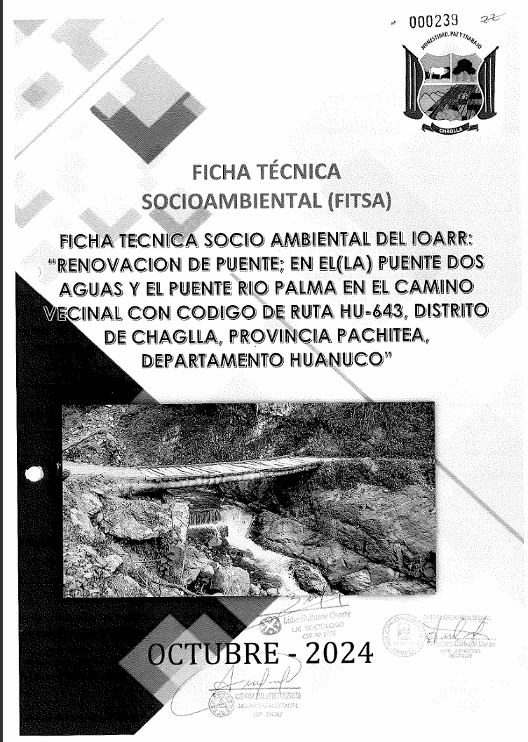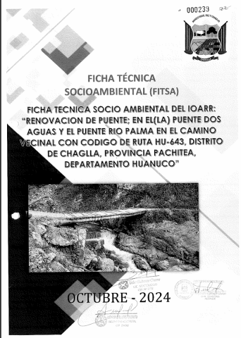 La presente Ficha Técnica Socio Ambiental tiene como objetivo fundamental definir los lineamientos ambientales que deberá de seguir el proyecto durante su vida útil; así como, identificar y evaluar los posibles impactos ambientales que podría generarse y a su vez, establecer medidas socio ambientales de prevención, mitigación y control de la IOARR: "RENOVACION DE PUENTE; EN EL(LA) PUENTE DOS AGUAS Y EL PUENTE RIO PALMA EN EL CAMINO VECINAL CON CODIGO DE RUTA HU-643, DISTRITO DE CHAGLLA, PROVINCIA PACHITEA, DEPARTAMENTO HUANUCO" y brindar una adecuada comunicación vial y mejorar ampliamente las condiciones de transitabilidad.