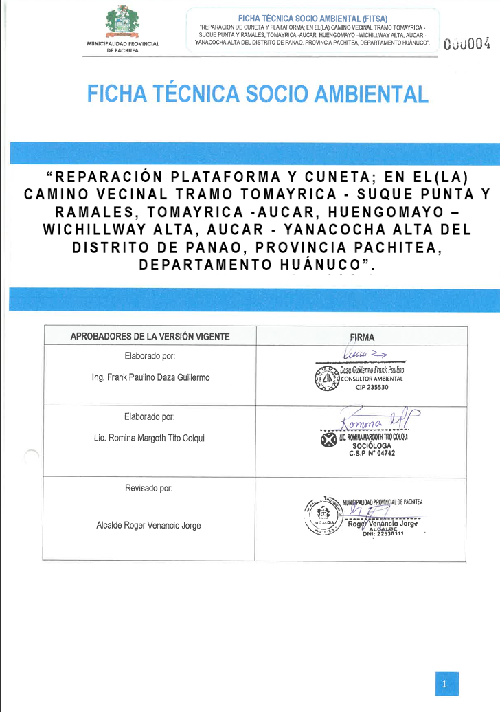 El objetivo general de la presente Ficha Técnica Socio Ambiental (FITSA) es establecer medidas de adecuación, mitigación y/o manejo ambiental necesarias para la gestión de los impactos ambientales y sociales ocasionados por la construcción, operación y mantenimiento del proyecto: "REPARACION DE CUNETA Y PLATAFORMA; EN EL(LA) CAMINO VECINAL TRAMO TOMAYRICA SUQUE PUNTA Y RAMALES, TOMAYRICA -AUCAR, HUENGOMAYO -WICHILLWAY ALTA, AUCAR - YANACOCHA ALTA DEL DISTRITO DE PANAO, PROVINCIA PACHITEA, DEPARTAMENTO HUANUCO". En concordancia con la legislación vigente y de forma sostenible y participativa.