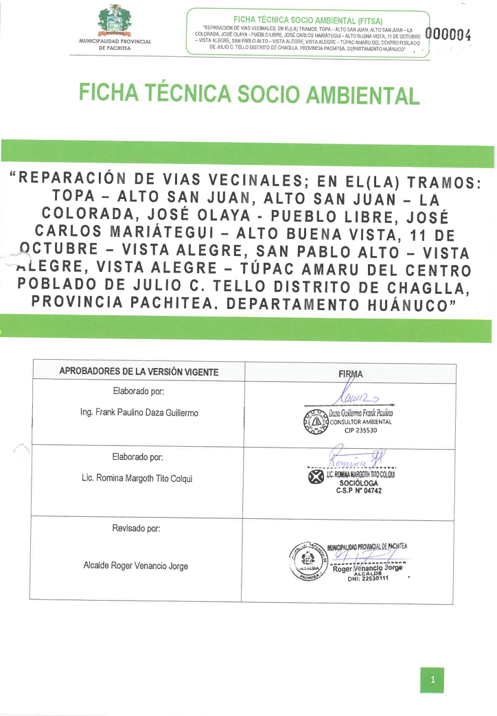 El objetivo general de la presente Ficha Técnica Socio Ambiental (FITSA) es establecer medidas de adecuación, mitigación y/o manejo ambiental necesarias para la gestión de los impactos ambientales y sociales ocasionados por la construcción, operación y mantenimiento del proyecto: "REPARACION DE VIAS VECINALES; EN EL(LA) TRAMOS: TOPA - ALTO SAN JUAN, ALTO SAN JUAN LA COLORADA, JOSÉ OLAYA - PUEBLO LIBRE, JOSÉ CARLOS MARIÁTEGUI - ALTO BUENA VISTA, 11 DE OCTUBRE VISTA ALEGRE, SAN PABLO ALTO VISTA ALEGRE, VISTA ALEGRE-TÚPAC AMARU DEL CENTRO POBLADO DE JULIO C. TELLO DISTRITO DE CHAGLLA, PROVINCIA PACHITEA, DEPARTAMENTO HUÁNUCO";. En concordancia con la legislación vigente y de forma sostenible y participativa.