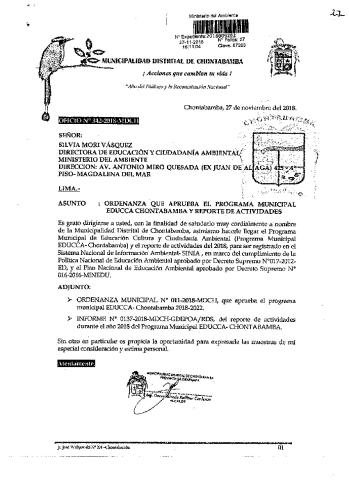 Y de acuerdo al instructivo para elaborar e implementar del Programa Municipal de EDUCCA (Resolución Ministerial N°456- 2018- MINAM), la Municipalidad Distrital de Chontabamba remite al MINAM las actividades desarrolladas el 2018 en el marco del Programa Municipal EDUCCA- Chontabamba aprobado con Ordenanza Municipal N° 011-2018-MDCH el 31 de octubre del 2018.