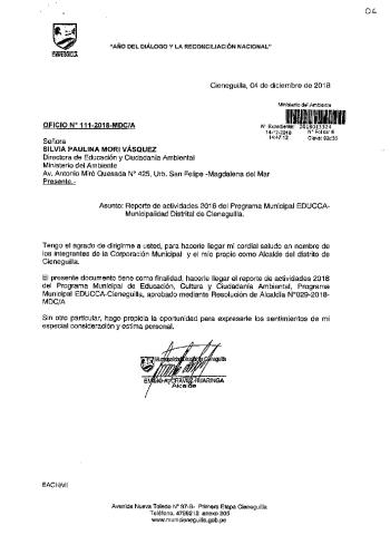 Y de acuerdo al instructivo para elaborar e implementar del Programa Municipal de EDUCCA (Resolución Ministerial N°456- 2018- MINAM), la Municipalidad Distrital de Cieneguilla remite al MINAM las actividades desarrolladas el 2018 en el marco del Programa Municipal EDUCCA-CIENEGUILLA aprobado mediante Resolución de Alcaldía N° 029-2018-MDC/A de fecha 07 de mayo del 2018