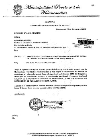 Y de acuerdo al instructivo para elaborar e implementar del Programa Municipal de EDUCCA (Resolución Ministerial N°456- 2018- MINAM), la Municipalidad Provincial de Huancavelica remite al MINAM las actividades desarrolladas el 2018 en el marco del Programa Municipal EDUCCA- Huancavelica aprobado con Resolución de Alcaldía N° 302-2017-AL/MPH el 13 de diciembre del 2017.