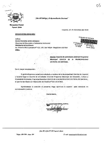 Y de acuerdo al instructivo para elaborar e implementar del Programa Municipal de EDUCCA (Resolución Ministerial N°456- 2018- MINAM), la Municipalidad Distrital de Imperial remite al MINAM las actividades desarrolladas el 2018 en el marco del Programa Municipal EDUCCA-Imperial aprobado con Resolución de Alcaldía N° 165-2018-MDI el 28 de junio 2018