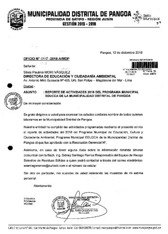 Y de acuerdo al instructivo para elaborar e implementar del Programa Municipal de EDUCCA (Resolución Ministerial N°456- 2018- MINAM), la Municipalidad Distrital de Pangoa remite al MINAM las actividades desarrolladas el 2018 en el marco del Programa Municipal EDUCCA- Pangoa aprobado con Ordenanza Municipal N° 152-2017-CM/-MDP el 20 de diciembre del 2017.