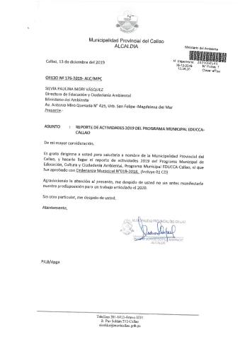 De acuerdo al instructivo para elaborar e implementar el Programa Municipal EDUCCA (Resolución Ministerial N°456- 2018- MINAM), la Municipalidad Provincial del Callao, remite al MINAM las actividades desarrolladas durante el 2019 en el marco del Programa Municipal EDUCCA.