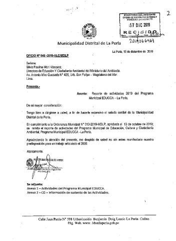 De acuerdo al instructivo para elaborar e implementar el Programa Municipal EDUCCA (Resolución Ministerial N°456- 2018- MINAM), la Municipalidad Distrital de La Perla, remite al MINAM las actividades desarrolladas durante el 2019 en el marco del Programa Municipal EDUCCA.