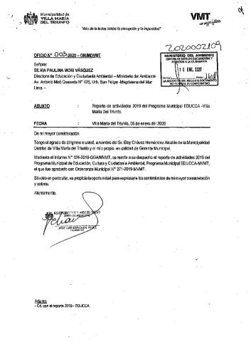 De acuerdo al instructivo para elaborar e implementar el Programa Municipal EDUCCA (Resolución Ministerial N°456- 2018- MINAM), la Municipalidad Distrital de Villa María del Triunfo, remite al MINAM las actividades desarrolladas durante el 2019 en el marco del Programa Municipal EDUCCA.