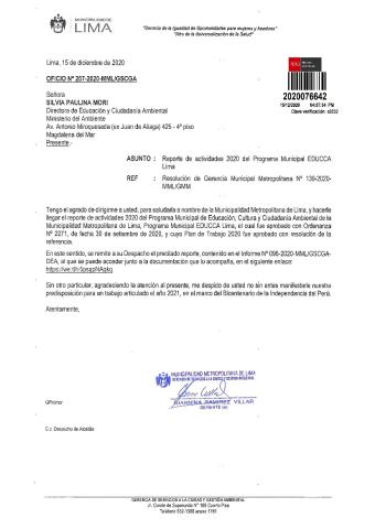 De acuerdo al instructivo para elaborar e implementar el Programa Municipal EDUCCA (Resolución Ministerial N°456- 2018- MINAM), la Municipalidad Metropolitana de Lima, remite al MINAM las actividades desarrolladas durante el 2020 en el marco del Programa Municipal EDUCCA.
