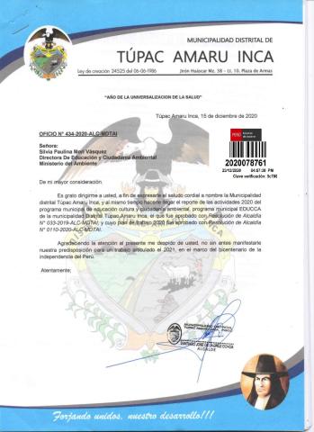 Y de acuerdo al instructivo para elaborar e implementar del Programa Municipal EDUCCA (Resolución Ministerial N°456-2018-MINAM), la Municipalidad Distrital de Túpac Amaru Inca-Pisco-Ica, remite al MINAM las actividades desarrolladas el 2020 en el marco del Programa Municipal EDUCCA-Túpac Amaru Inca.