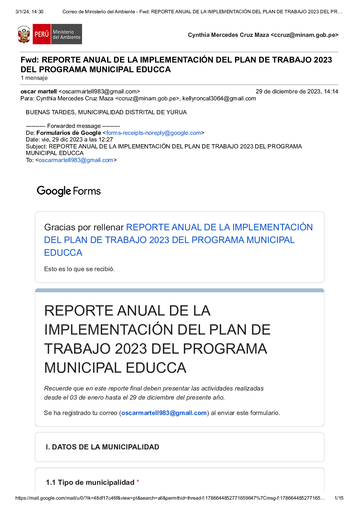 En este Reporte Anual de la implementación del Plan de Trabajo 2023 del Programa Municipal EDUCCA, se presentan las tareas y actividades realizadas durante el período del 3 de enero al 29 de diciembre de 2023. El documento ha sido elaborado por la Municipalidad Distrital de Yurua, Provincia de Atalaya, Región Ucayali, como parte de sus acciones en el marco del Programa Municipal EDUCCA.