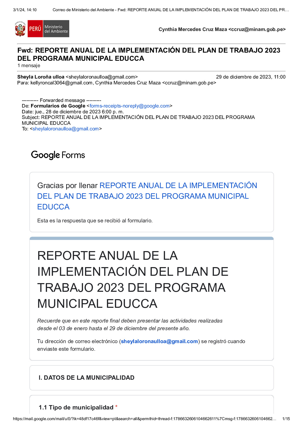 En este Reporte Anual de la implementación del Plan de Trabajo 2023 del Programa Municipal EDUCCA, se presentan las tareas y actividades realizadas durante el período del 3 de enero al 29 de diciembre de 2023. El documento ha sido elaborado por la Municipalidad Provincial de Atalaya, región Ucayali, como parte de sus acciones en el marco del Programa Municipal EDUCCA.