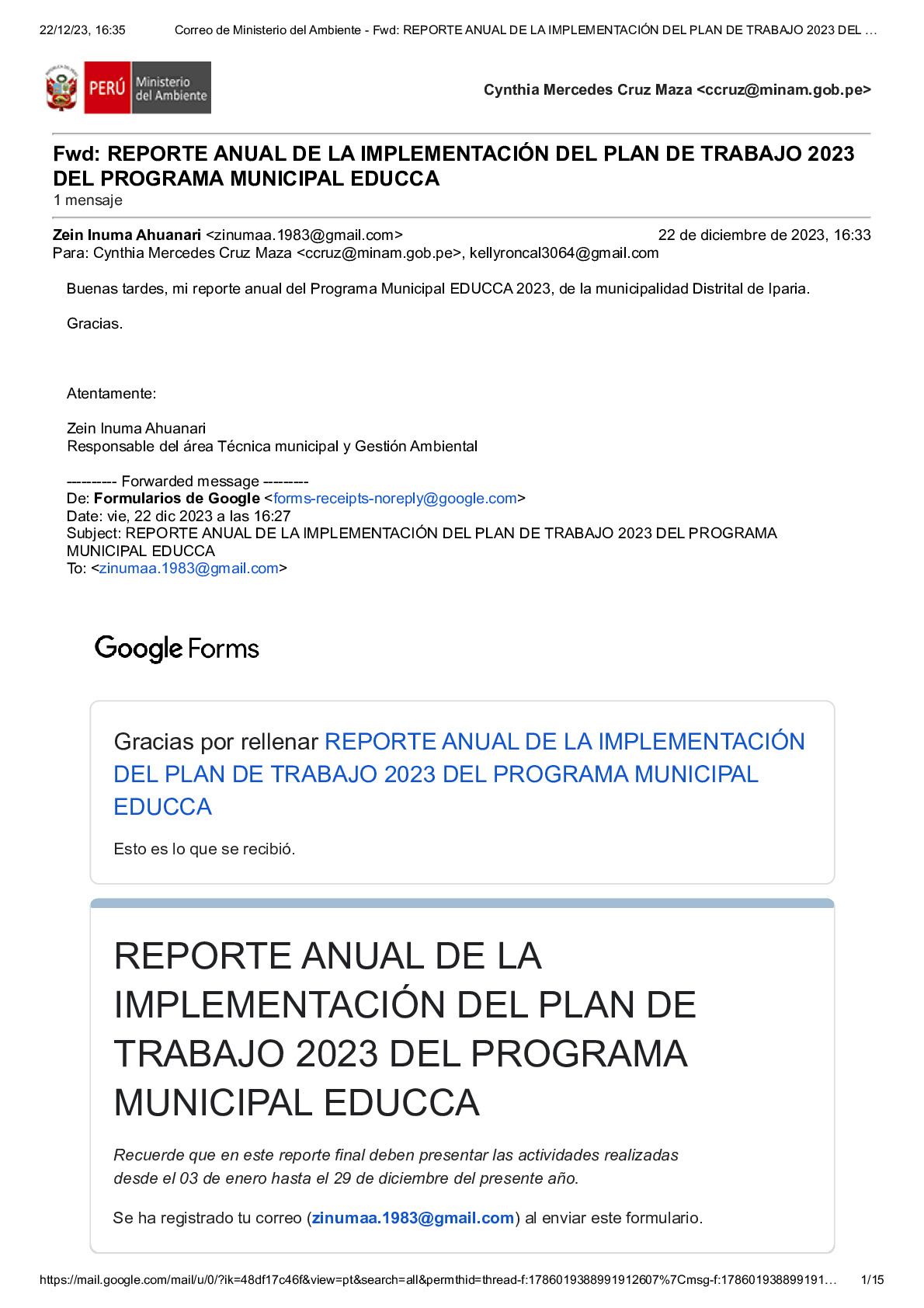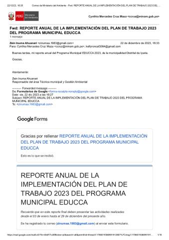 En este Reporte Anual de la implementación del Plan de Trabajo 2023 del Programa Municipal EDUCCA, se presentan las tareas y actividades realizadas durante el período del 3 de enero al 29 de diciembre de 2023. El documento ha sido elaborado por la Municipalidad Distrital de Iparia, provincia de Coronel Portillo, región Ucayali, como parte de sus acciones en el marco del Programa Municipal EDUCCA.