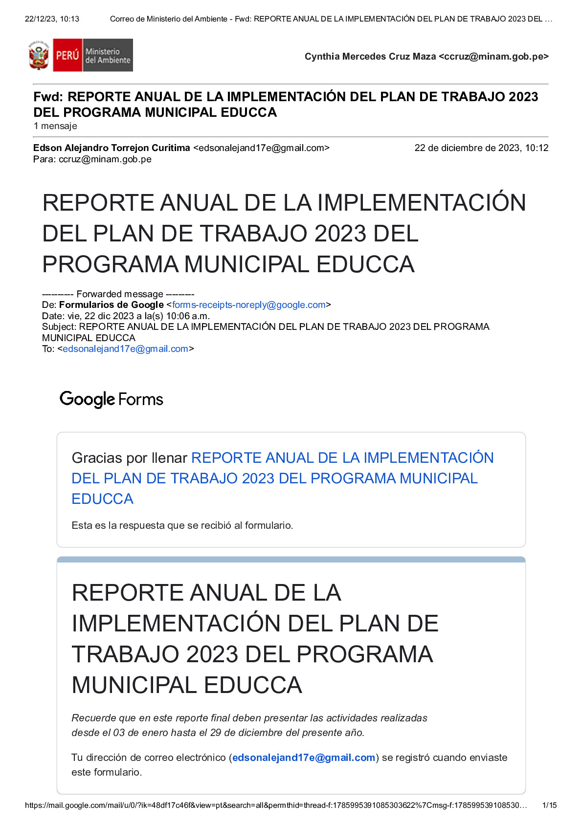 En este Reporte Anual de la implementación del Plan de Trabajo 2023 del Programa Municipal EDUCCA, se presentan las tareas y actividades realizadas durante el período del 3 de enero al 29 de diciembre de 2023. El documento ha sido elaborado por la Municipalidad Distrital de Parinari, provincia de Loreto, región Loreto, como parte de sus acciones en el marco del Programa Municipal EDUCCA.