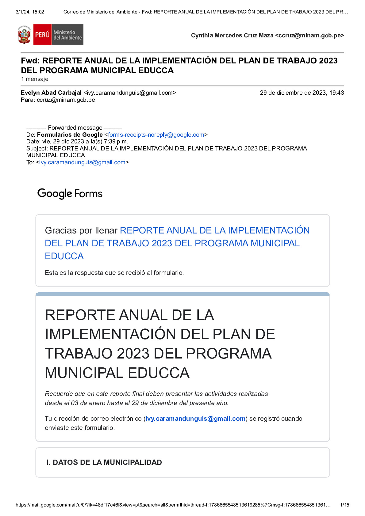 En este Reporte Anual de la implementación del Plan de Trabajo 2023 del Programa Municipal EDUCCA, se presentan las tareas y actividades realizadas durante el período del 3 de enero al 29 de diciembre de 2023. El documento ha sido elaborado por la Municipalidad Distrital de Molino, Provincia de Pachitea, Región Huánuco, como parte de sus acciones en el marco del Programa Municipal EDUCCA.