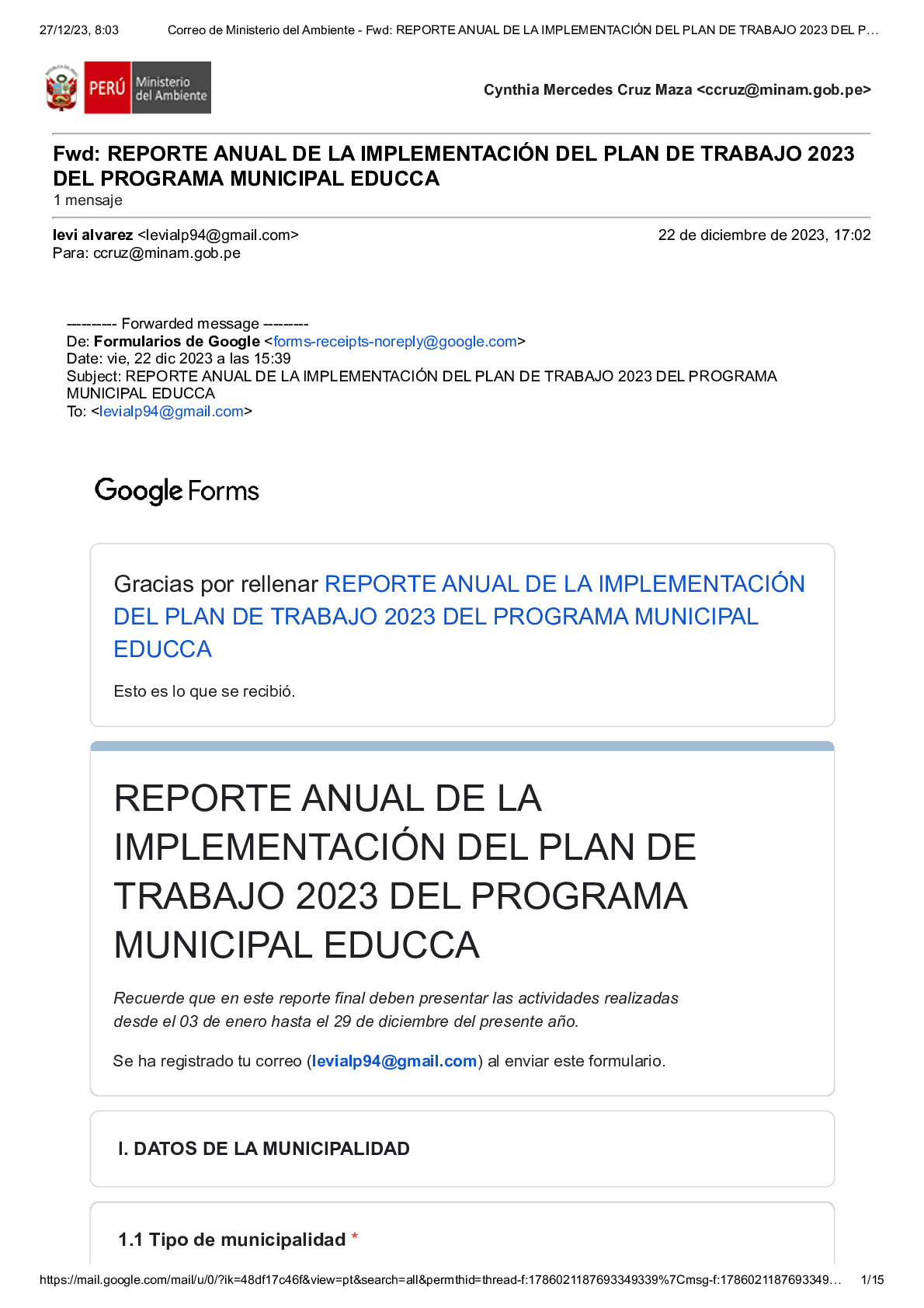 En este Reporte Anual de la implementación del Plan de Trabajo 2023 del Programa Municipal EDUCCA, se presentan las tareas y actividades realizadas durante el período del 3 de enero al 29 de diciembre de 2023. El documento ha sido elaborado por la Municipalidad Distrital de Curimaná, provincia de Padre Abad, región Ucayali, como parte de sus acciones en el marco del Programa Municipal EDUCCA.