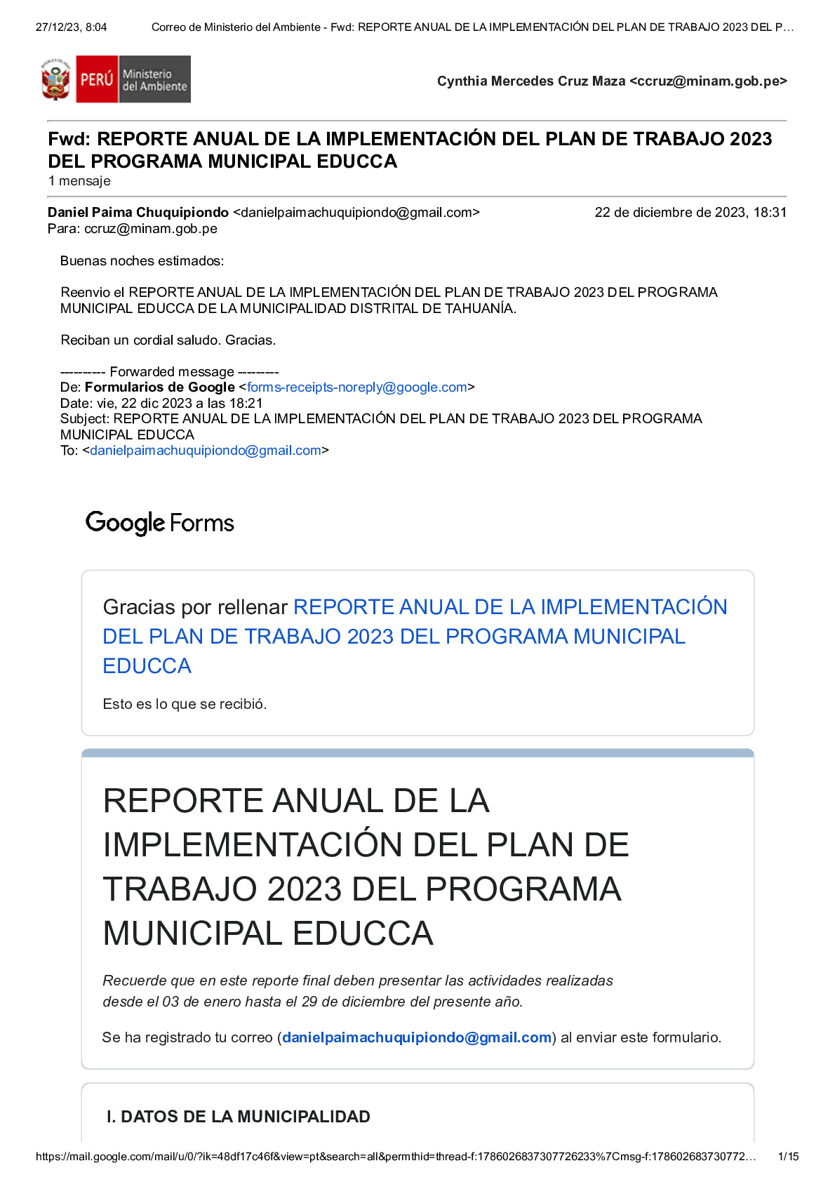 En este Reporte Anual de la implementación del Plan de Trabajo 2023 del Programa Municipal EDUCCA, se presentan las tareas y actividades realizadas durante el período del 3 de enero al 29 de diciembre de 2023. El documento ha sido elaborado por la Municipalidad Provincial de Tahuania, provincia de Atalaya, región Ucayali, como parte de sus acciones en el marco del Programa Municipal EDUCCA.