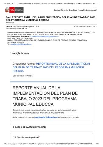 En este Reporte Anual de la implementación del Plan de Trabajo 2023 del Programa Municipal EDUCCA, se presentan las tareas y actividades realizadas durante el período del 3 de enero al 29 de diciembre de 2023. El documento ha sido elaborado por la Municipalidad Distrital de Yarinacocha, provincia de Coronel Portillo, región Ucayali, como parte de sus acciones en el marco del Programa Municipal EDUCCA.