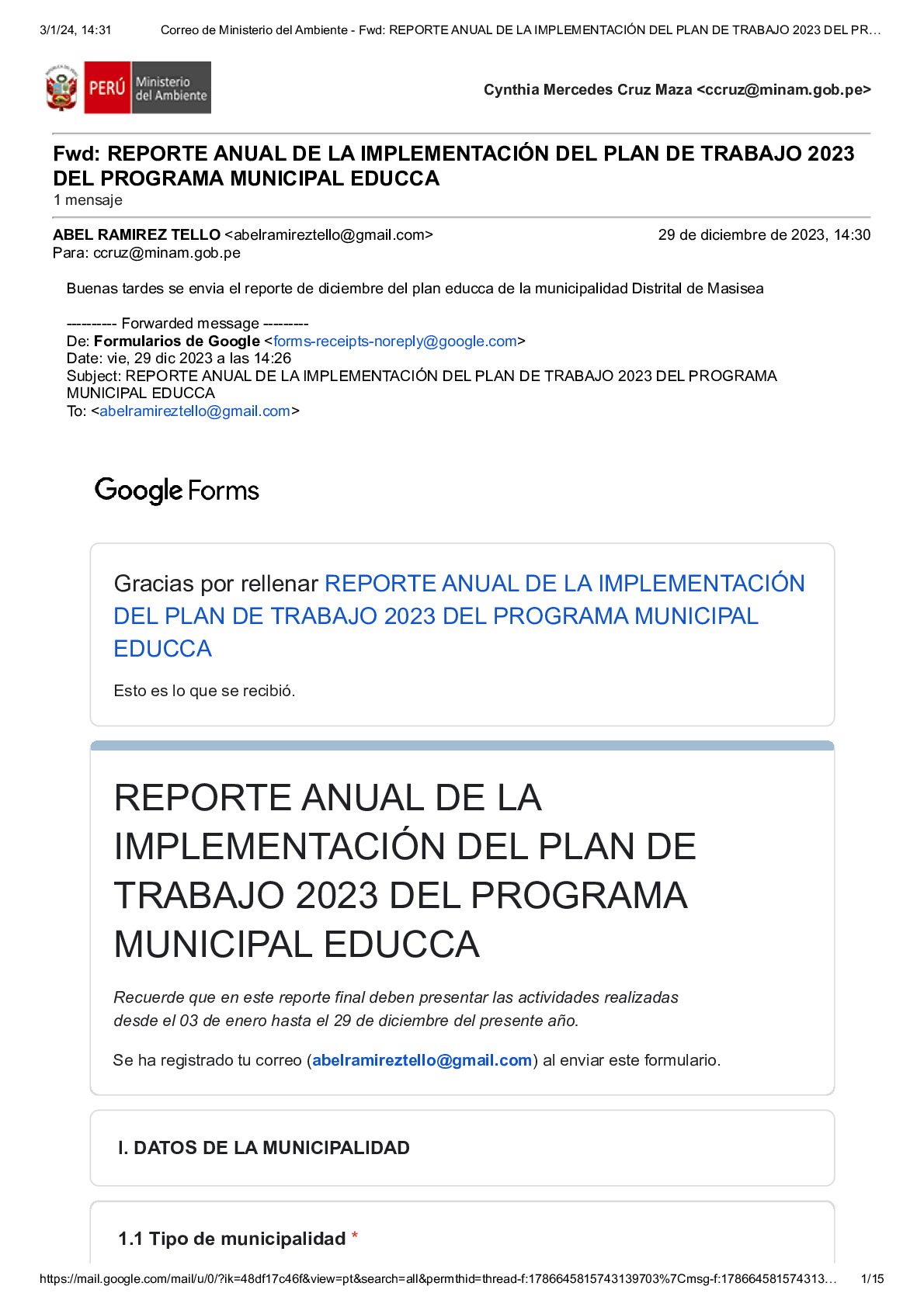 En este Reporte Anual de la implementación del Plan de Trabajo 2023 del Programa Municipal EDUCCA, se presentan las tareas y actividades realizadas durante el período del 3 de enero al 29 de diciembre de 2023. El documento ha sido elaborado por la Municipalidad Distrital de Masisea , provincia de Coronel Portillo, región Ucayali, como parte de sus acciones en el marco del Programa Municipal EDUCCA.