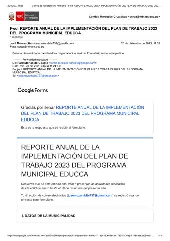 En este Reporte Anual de la implementación del Plan de Trabajo 2023 del Programa Municipal EDUCCA, se presentan las tareas y actividades realizadas durante el período del 3 de enero al 29 de diciembre de 2023. El documento ha sido elaborado por la Municipalidad Distrital de San Juan Bautista, provincia de Maynas, región Loreto, como parte de sus acciones en el marco del Programa Municipal EDUCCA.