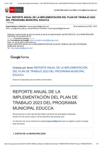 En este Reporte Anual de la implementación del Plan de Trabajo 2023 del Programa Municipal EDUCCA, se presentan las tareas y actividades realizadas durante el período del 3 de enero al 29 de diciembre de 2023. El documento ha sido elaborado por la Municipalidad Distrital de Guadalupito, provincia de Viru, región La Libertad, como parte de sus acciones en el marco del Programa Municipal EDUCCA.