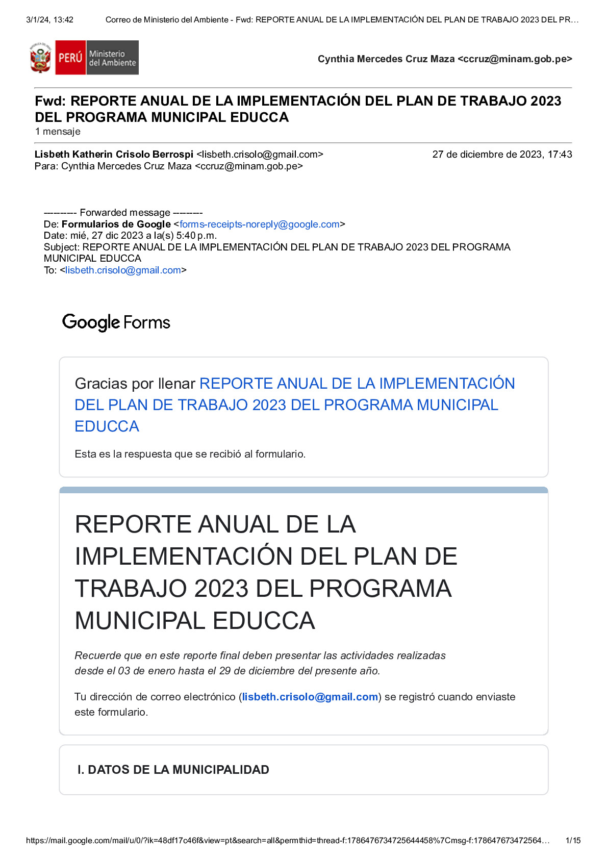 En este Reporte Anual de la implementación del Plan de Trabajo 2023 del Programa Municipal EDUCCA, se presentan las tareas y actividades realizadas durante el período del 3 de enero al 29 de diciembre de 2023. El documento ha sido elaborado por la Municipalidad Distrital de Comandante Noel, provincia de Casma, región Áncash, como parte de sus acciones en el marco del Programa Municipal EDUCCA.