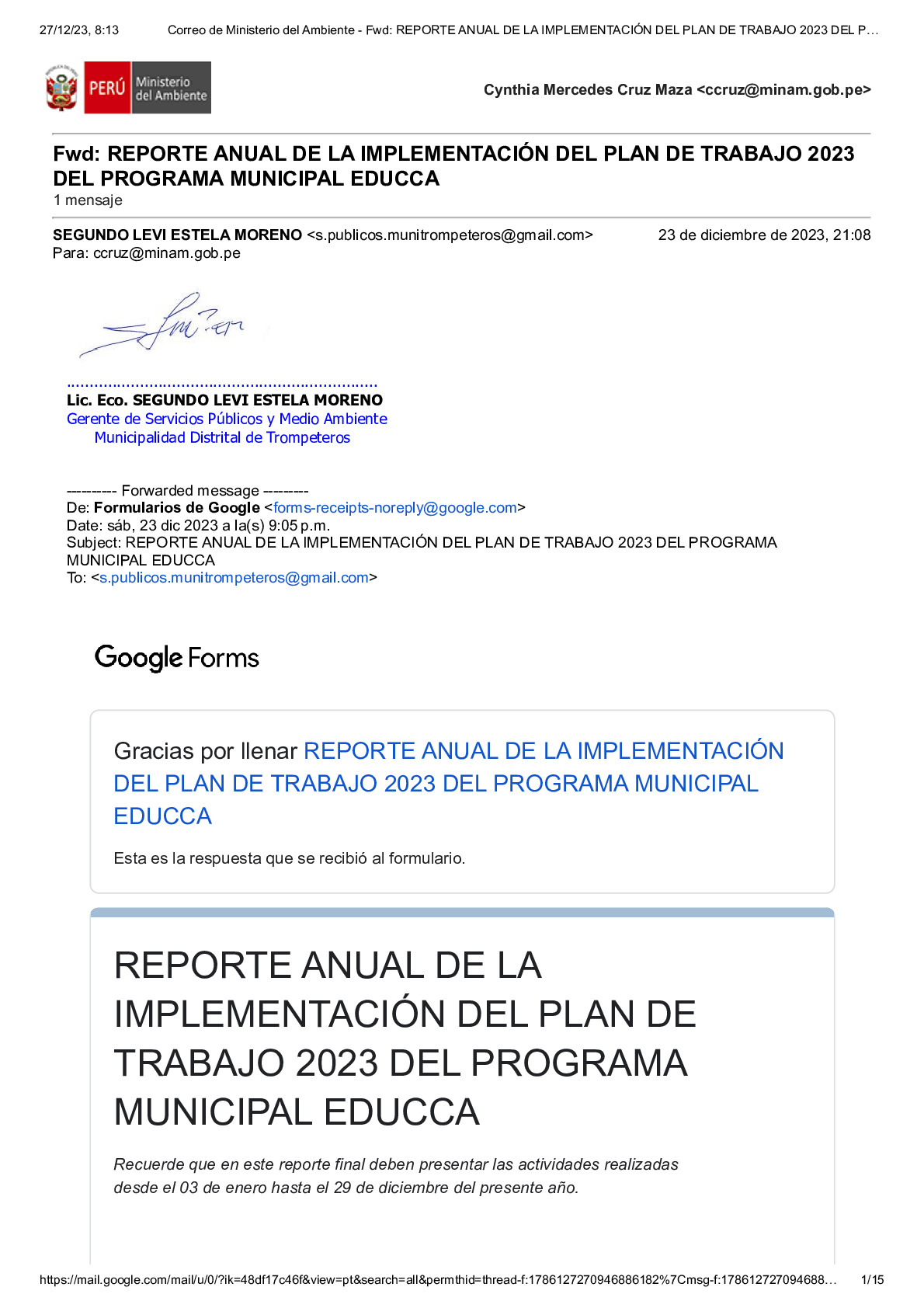 En este Reporte Anual de la implementación del Plan de Trabajo 2023 del Programa Municipal EDUCCA, se presentan las tareas y actividades realizadas durante el período del 3 de enero al 29 de diciembre de 2023. El documento ha sido elaborado por la Municipalidad Distrital de Trompeteros, provincia de Loreto, región Loreto, como parte de sus acciones en el marco del Programa Municipal EDUCCA.