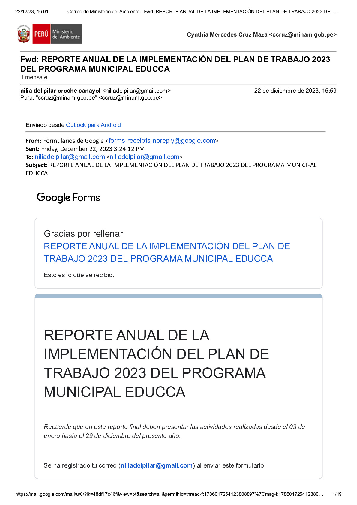 En este Reporte Anual de la implementación del Plan de Trabajo 2023 del Programa Municipal EDUCCA, se presentan las tareas y actividades realizadas durante el período del 3 de enero al 29 de diciembre de 2023. El documento ha sido elaborado por la Municipalidad Provincial de Loreto, región Loreto, como parte de sus acciones en el marco del Programa Municipal EDUCCA.