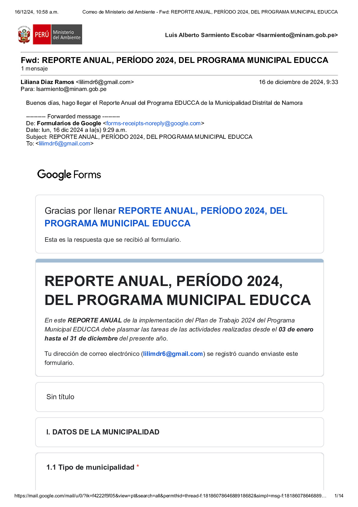 En este Reporte Anual de la implementación del Plan de Trabajo 2024 del Programa Municipal EDUCCA, se presentan las tareas y actividades realizadas durante el período del 3 de enero al 31 de diciembre de 2024. El documento ha sido elaborado por la Municipalidad Distrital de Namora, provincia de Cajamarca, región Cajamarca, como parte de sus acciones en el marco del Programa Municipal EDUCCA.