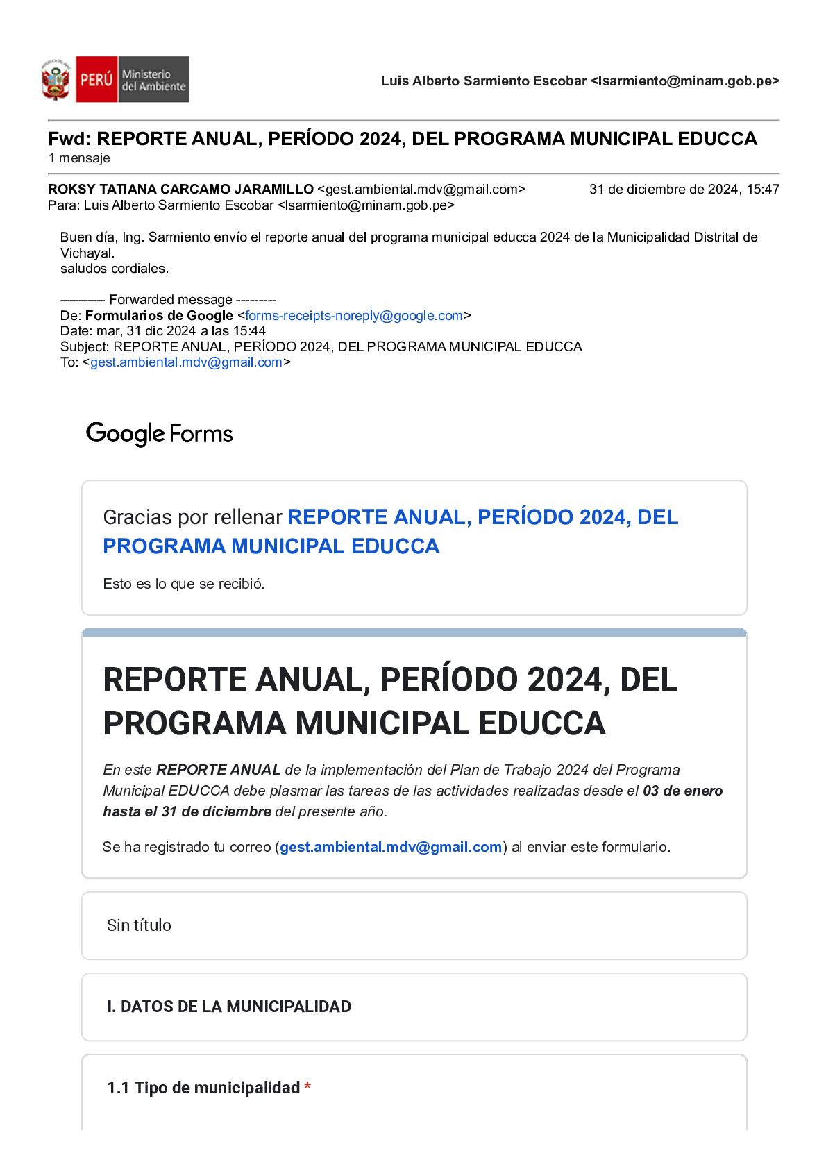 En este Reporte Anual de la implementación del Plan de Trabajo 2024 del Programa Municipal EDUCCA, se presentan las tareas y actividades realizadas durante el período del 3 de enero al 31 de diciembre de 2024. El documento ha sido elaborado por la Municipalidad Distrital de Vichayal, provincia de Paita, región Piura, como parte de sus acciones en el marco del Programa Municipal EDUCCA.