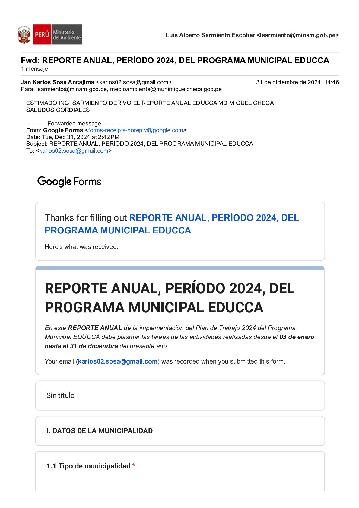 En este Reporte Anual de la implementación del Plan de Trabajo 2024 del Programa Municipal EDUCCA, se presentan las tareas y actividades realizadas durante el período del 3 de enero al 31 de diciembre de 2024. El documento ha sido elaborado por la Municipalidad Distrital de Miguel Checa, provincia de Sullana, región Piura, como parte de sus acciones en el marco del Programa Municipal EDUCCA.