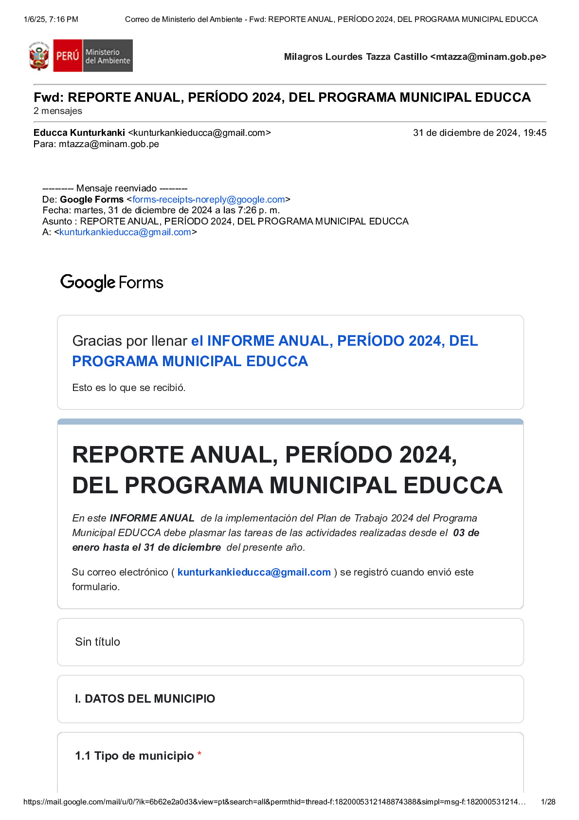 En este Reporte Anual de la implementación del Plan de Trabajo 2024 del Programa Municipal EDUCCA, se presentan las tareas y actividades realizadas durante el período del 3 de enero al 31 de diciembre de 2024. El documento ha sido elaborado por la Municipalidad Distrital de Kunturkanki, provincia de Cañas, región Cusco, como parte de sus acciones en el marco del Programa Municipal EDUCCA.