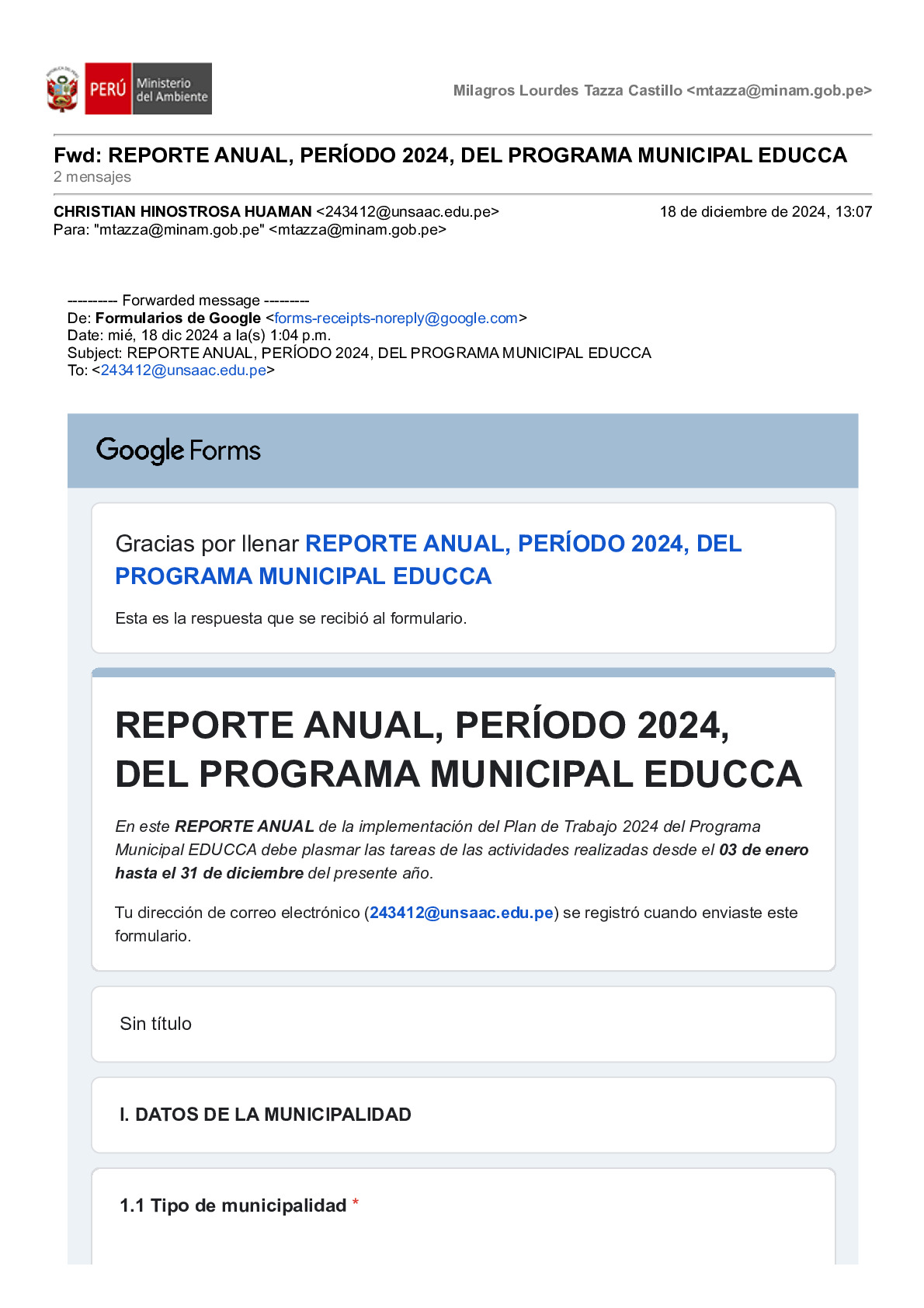 En este Reporte Anual de la implementación del Plan de Trabajo 2024 del Programa Municipal EDUCCA, se presentan las tareas y actividades realizadas durante el período del 3 de enero al 31 de diciembre de 2024. El documento ha sido elaborado por la Municipalidad Distrital de Poroy, provincia de Cusco, región Cusco, como parte de sus acciones en el marco del Programa Municipal EDUCCA.