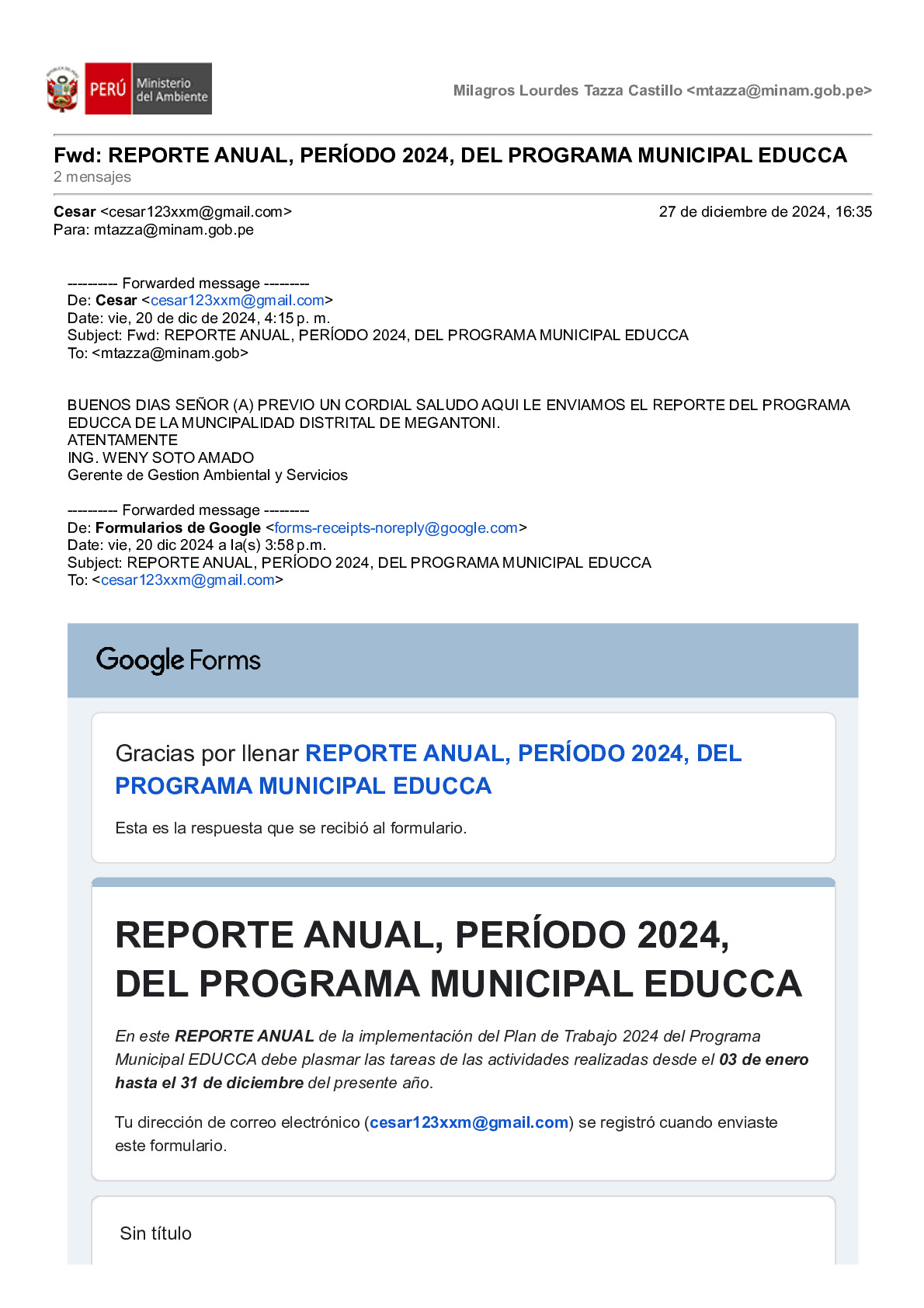 En este Reporte Anual de la implementación del Plan de Trabajo 2024 del Programa Municipal EDUCCA, se presentan las tareas y actividades realizadas durante el período del 3 de enero al 31 de diciembre de 2024. El documento ha sido elaborado por la Municipalidad Distrital de Megantoni, provincia de La Convención, región Cusco, como parte de sus acciones en el marco del Programa Municipal EDUCCA.