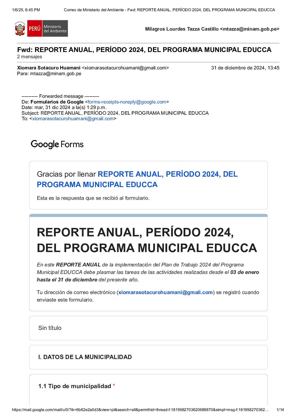 En este Reporte Anual de la implementación del Plan de Trabajo 2024 del Programa Municipal EDUCCA, se presentan las tareas y actividades realizadas durante el período del 3 de enero al 31 de diciembre de 2024. El documento ha sido elaborado por la Municipalidad Distrital de Ascensión, provincia de Huancavelica, región Huancavelica, como parte de sus acciones en el marco del Programa Municipal EDUCCA.