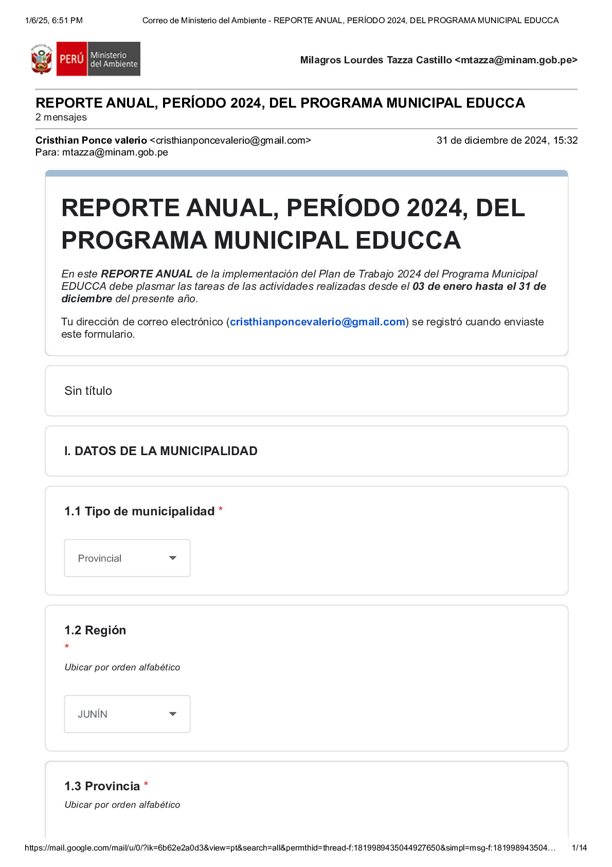 En este Reporte Anual de la implementación del Plan de Trabajo 2024 del Programa Municipal EDUCCA, se presentan las tareas y actividades realizadas durante el período del 3 de enero al 31 de diciembre de 2024. El documento ha sido elaborado por la Municipalidad Provincial de Junín, provincia de Junín, región Junín, como parte de sus acciones en el marco del Programa Municipal EDUCCA.