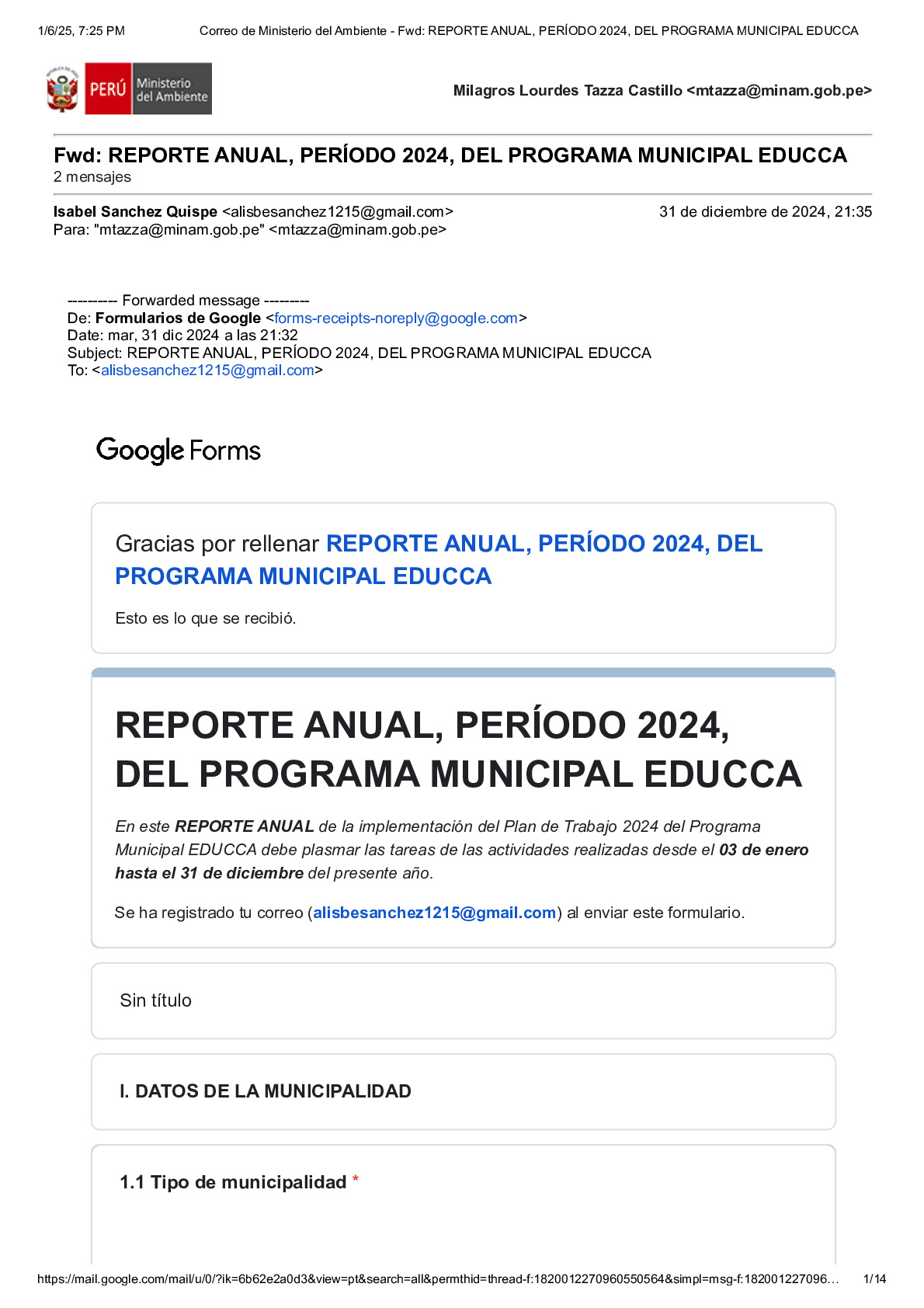 En este Reporte Anual de la implementación del Plan de Trabajo 2024 del Programa Municipal EDUCCA, se presentan las tareas y actividades realizadas durante el período del 3 de enero al 31 de diciembre de 2024. El documento ha sido elaborado por la Municipalidad Provincial del Manu, provincia del Manu, región Madre de Dios, como parte de sus acciones en el marco del Programa Municipal EDUCCA.