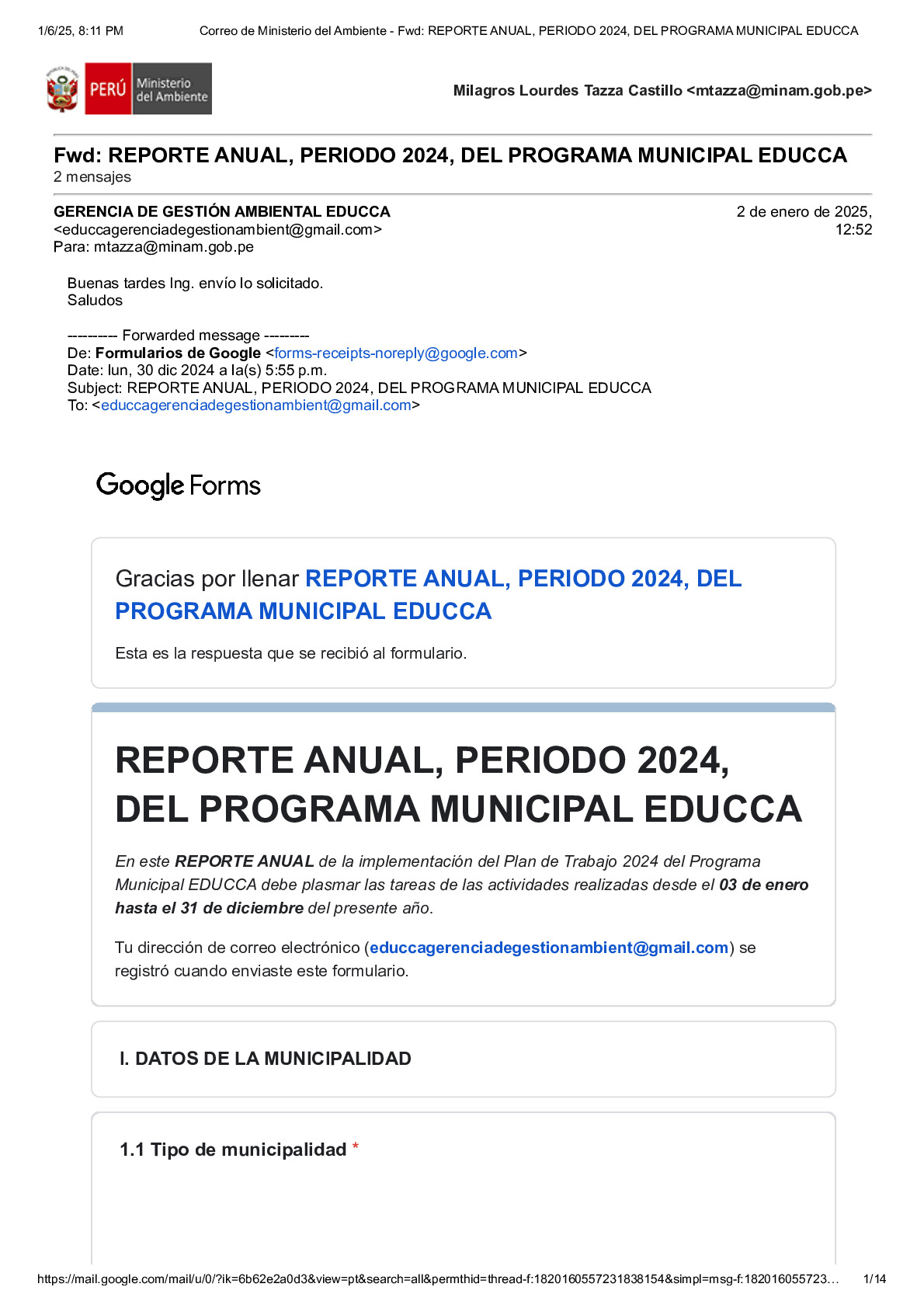 En este Reporte Anual de la implementación del Plan de Trabajo 2024 del Programa Municipal EDUCCA, se presentan las tareas y actividades realizadas durante el período del 3 de enero al 31 de diciembre de 2024. El documento ha sido elaborado por la Municipalidad Provincial de Tambopata, provincia de Tambopata, región Madre de Dios, como parte de sus acciones en el marco del Programa Municipal EDUCCA.